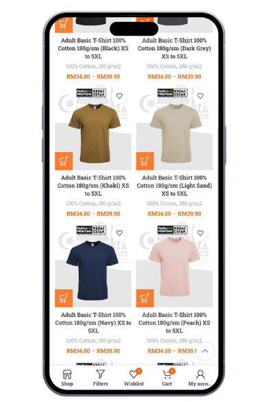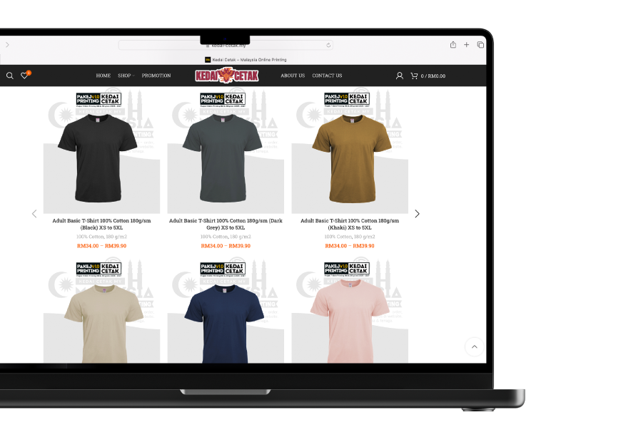 Pilih jenis produk (banner, t-shirt, kad kahwin, sticker, dll) > Upload design > Terus buat bayaran online.